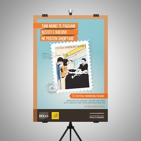 Në këtë drejtim, Agjencia ka bashkuar në mënyrë kreative simbolin e Postës Shqiptare me Intesa Sanpaolo Bank Albania, duke komunikuar këtë shërbim në një mënyrë shumë direkte dhe pozitive. Teknikat e dizajnit elegant nga ana vizuale janë të stilizuara dhe transmetojnë atë ndjesinë e ngrohtë që ne synojmë të krijojmë të klientët, shoqëruar nga një mesazh i thjeshtë dhe i drejtpërdrejtë. Kjo atmosferë pozitive përforcon impaktin e përgjithshëm të fushatës si dhe vendos theksin mbi efektivitetin e këtij shërbimi.